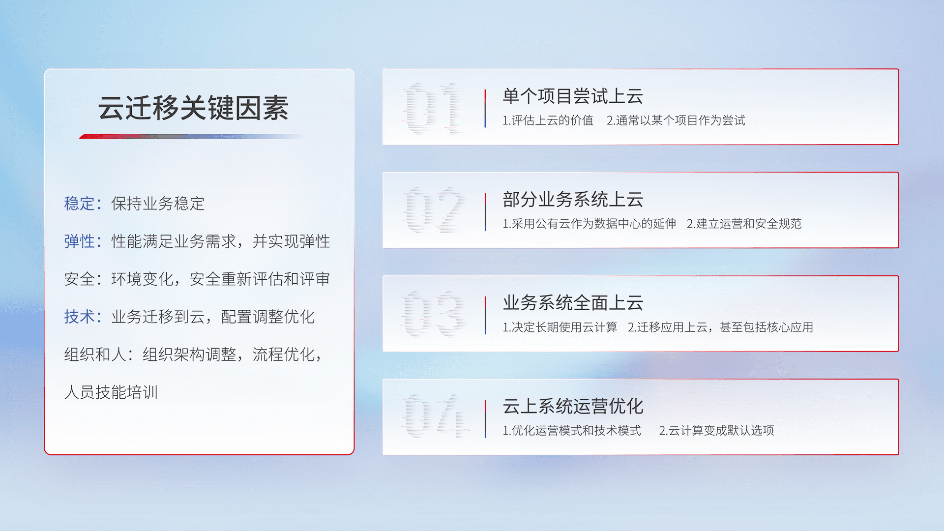 结合实际业务,,,,从规划设计、、、、云平台选型、、云原生改造、、、数据迁移、、集成交付,,,,迁移全过程为客户识别最佳上云路径,,,,做好风险识别管理,,,,设计网络架构、、身份权限、、、安全审计合规、、、操作审计、、日志审计、、、监控告警策略、、多站点容灾设计等,,对云上基础设施进行整体规划,,提升IT治理水平,,,,以满足弹性、、、、高可用、、、、高性能的需求。。。。