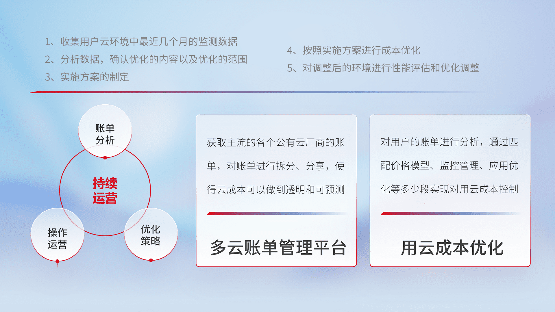 通过多云纳管,,,,以统一的资源数据模型把客户的云资源进行抽象和封装,,,,进而实现对多云资源的统一操作,,保障云资源管理的可靠性、、、、稳定性与可用性。。。量身定制化运维内容,,,配置、、开发运维、、、补丁管理、、、备份、、、监控、、、、认证和访问管理、、、、审计和日常巡检等,,保障在用云过程中的可靠度,,稳定度以及高可用率。。。