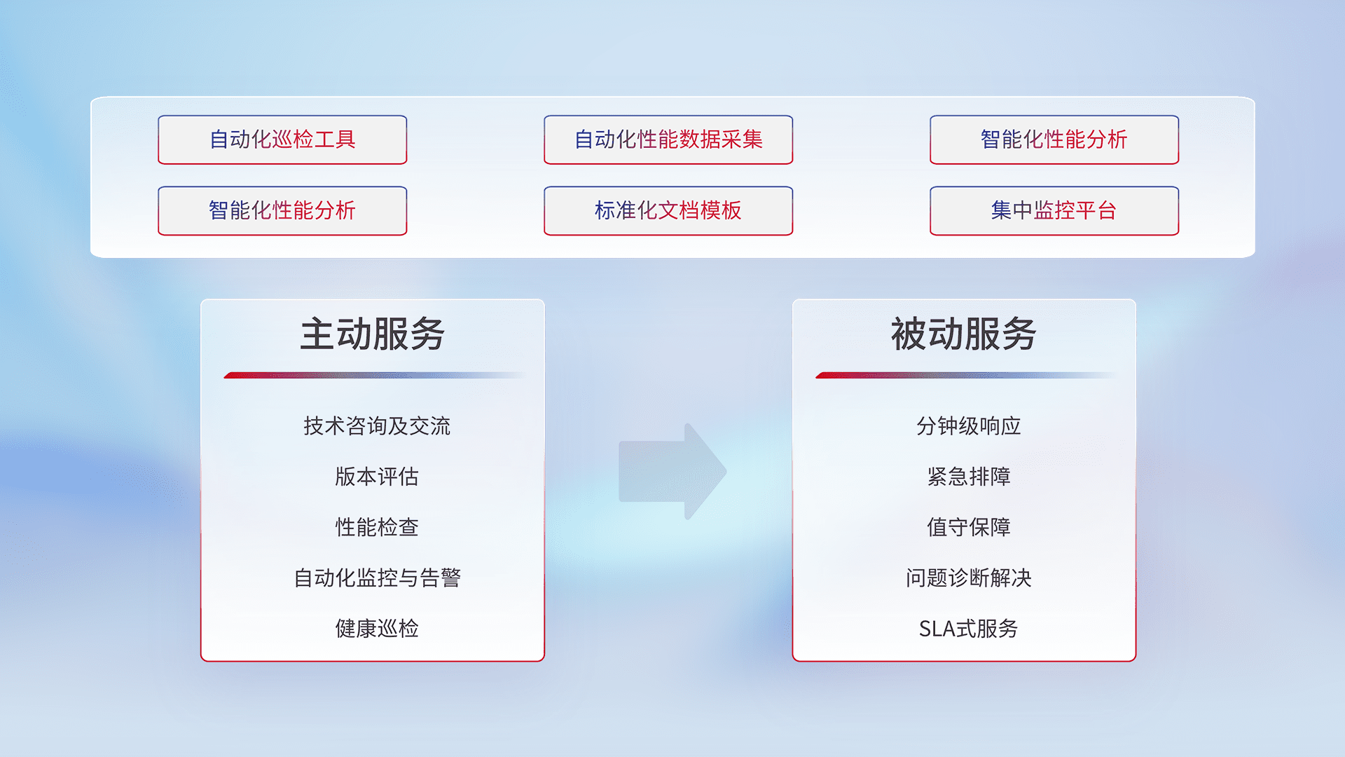 智能化工具和标准化文档,,保障服务质量,,,,提供主动服务(包含技术咨询、、、版本评估、、、性能检查、、、、自动化监控与告警、、、、健康巡检)和被动服务包含(分钟级响应、、、、紧急排障、、、值守保障、、、问题诊断解决、、、、SLA服务)。。。